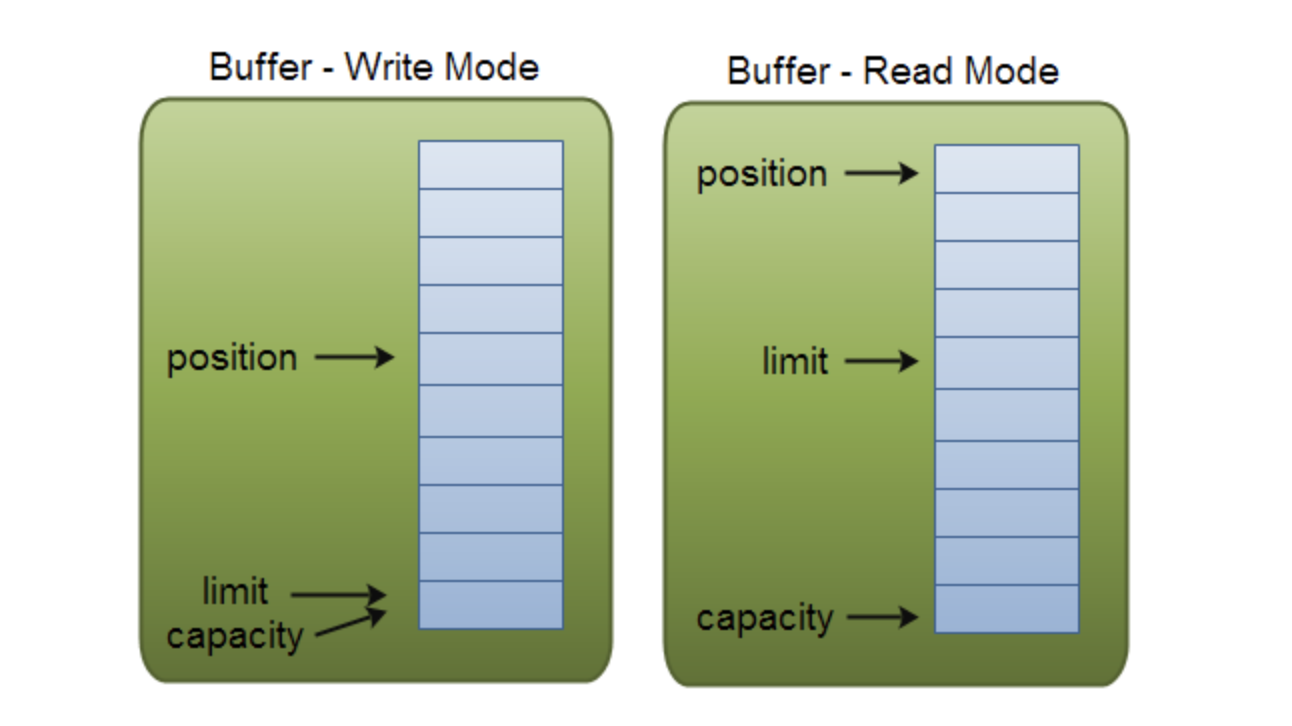 在写模式中,position代表了下一个可写的位置,limit为capacity-1(数组的最末位,也就是第一个不可写的位置), 在读模式中,position代表了第一个可以读的位置,limit则代表了第一个不可读的位置。buffer由读模式切换为写模式的时候 需要调用flip方法翻转一下,由写模式切换为读模式的时候需要调用clear(清空缓冲区,其实是将上述成员变量复位)或者compact (区别于clear方法,该方法在切换为写模式的时候,会将还没有来的及读的数据拷贝到数组的首端,position放到第一个可写的位置)方法。 mark在调用了mark方法的时候会记录当前的position的位置,后续可以使用reset方法来将position复位到mark所指定的标记位。