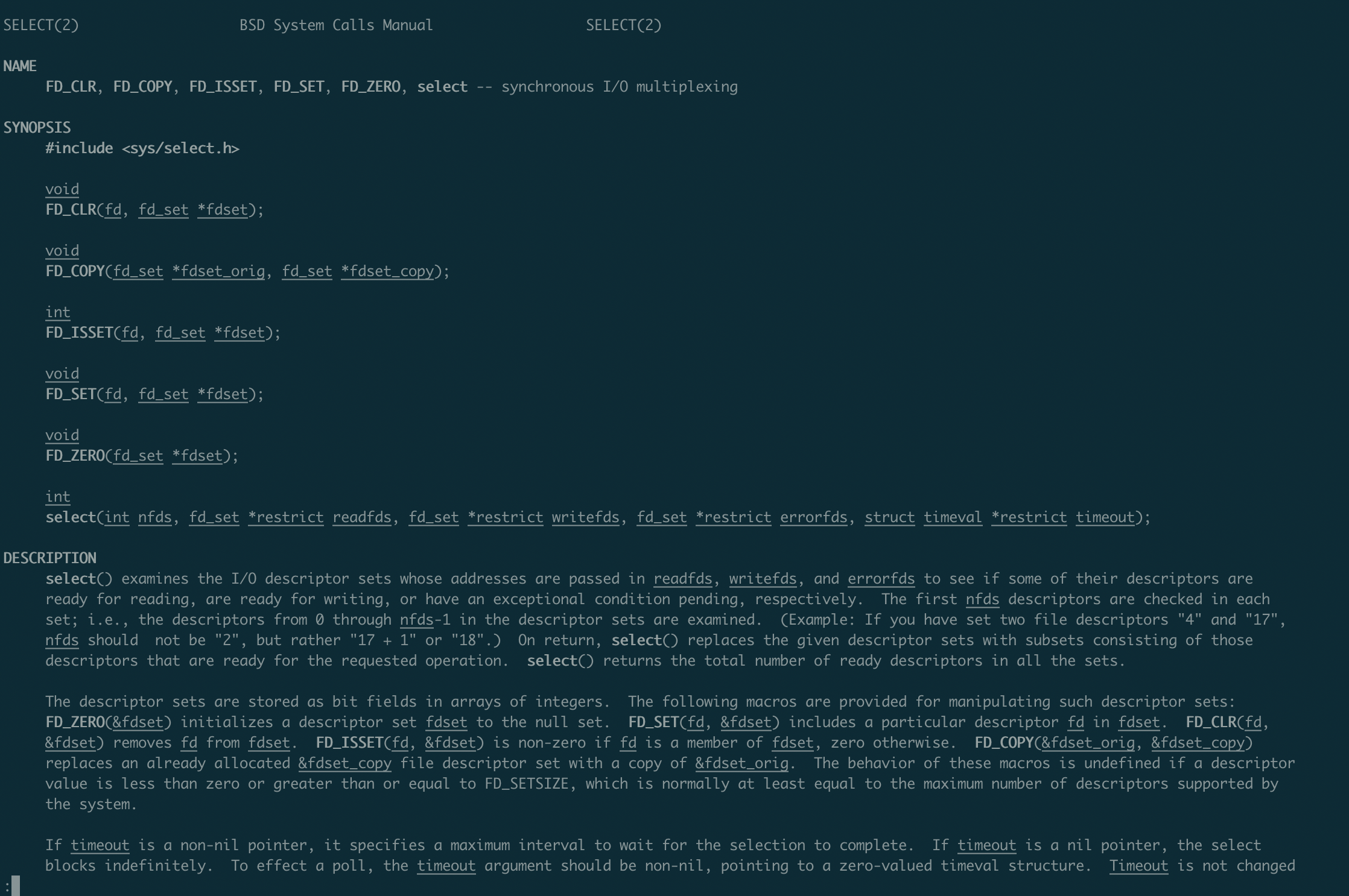 1 | int select(int maxfdp, fd_set *readfds, fd_set *writefds, fd_set *errorfds, struct timeval *timeout); |