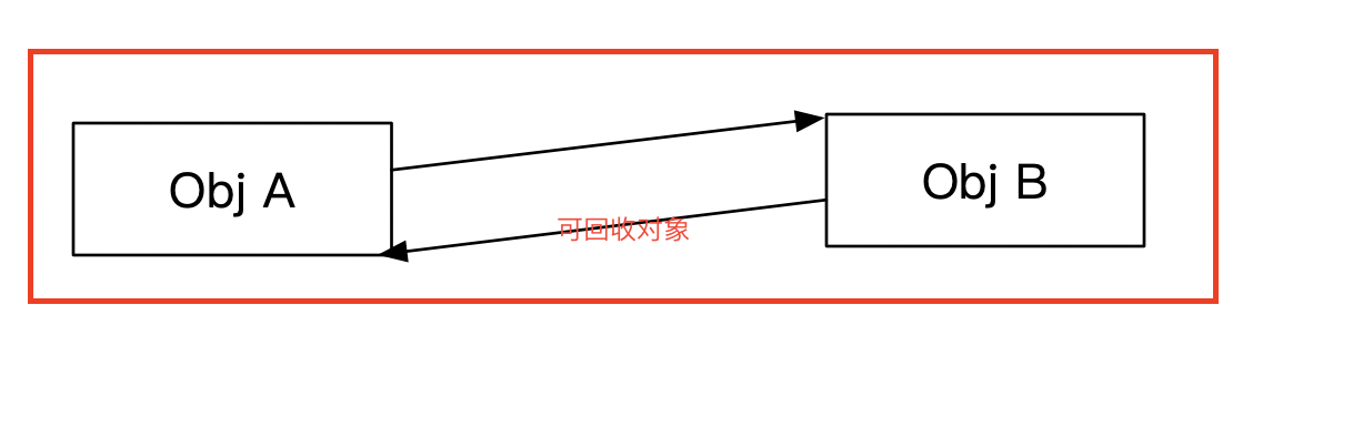 引用技术算法是通过在给对象添加一个引用计数器,对象被引用一次就将该计数值加1,当对象的引用值为0的时候,就可以确定该对象可以回收了,这种 算法有个缺点:循环引用。 如上图所示,假设Obj A和Obj B都可以被回收的情况下,A、B相互引用,那么这两个对象都不会被回收掉。 不过引用计数法还是有一些使用场景的,它的优点就是实现简单,只是在JVM中我们没有采用这种方式来对对象存活进行判定。