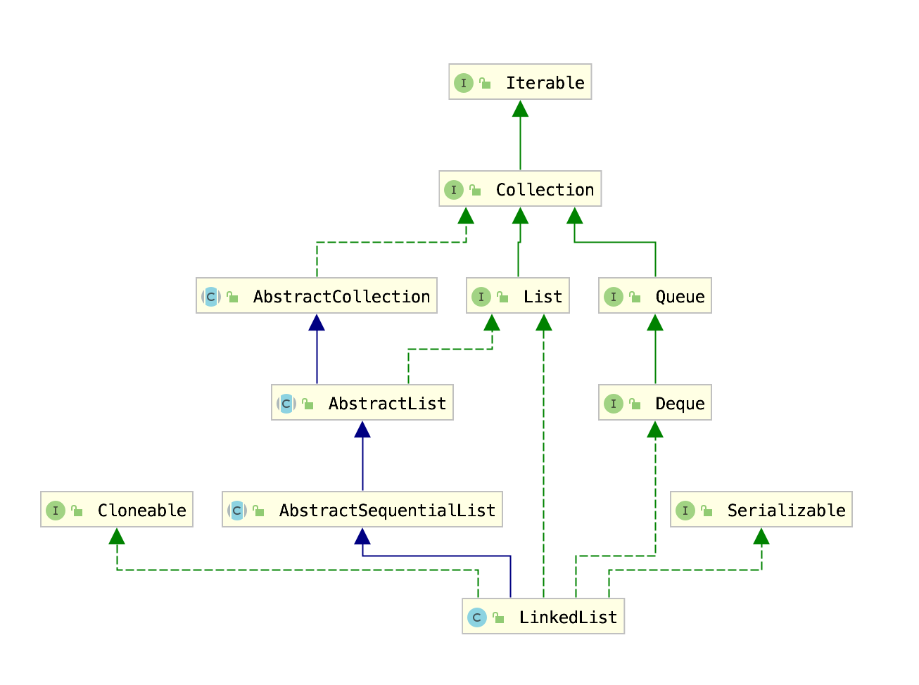 /** * Doubly-linked list implementation of the {@code List} and {@code Deque} * interfaces. Implements all optional list operations, and permits all * elements (including {@code null}). * * <p>All of the operations perform as could be expected for a doubly-linked * list. Operations that index into the list will traverse the list from * the beginning or the end, whichever is closer to the specified index. * * <p><strong>Note that this implementation is not synchronized.</strong> * If multiple threads access a linked list concurrently, and at least * one of the threads modifies the list structurally, it <i>must</i> be * synchronized externally. (A structural modification is any operation * that adds or deletes one or more elements; merely setting the value of * an element is not a structural modification.) This is typically * accomplished by synchronizing on some object that naturally * encapsulates the list. * * If no such object exists, the list should be "wrapped" using the * {@link Collections#synchronizedList Collections.synchronizedList} * method. This is best done at creation time, to prevent accidental * unsynchronized access to the list:<pre> * List list = Collections.synchronizedList(new LinkedList(...));</pre> * * <p>The iterators returned by this class's {@code iterator} and * {@code listIterator} methods are <i>fail-fast</i>: if the list is * structurally modified at any time after the iterator is created, in * any way except through the Iterator's own {@code remove} or * {@code add} methods, the iterator will throw a {@link * ConcurrentModificationException}. Thus, in the face of concurrent * modification, the iterator fails quickly and cleanly, rather than * risking arbitrary, non-deterministic behavior at an undetermined * time in the future. * * <p>Note that the fail-fast behavior of an iterator cannot be guaranteed * as it is, generally speaking, impossible to make any hard guarantees in the * presence of unsynchronized concurrent modification. Fail-fast iterators * throw {@code ConcurrentModificationException} on a best-effort basis. * Therefore, it would be wrong to write a program that depended on this * exception for its correctness: <i>the fail-fast behavior of iterators * should be used only to detect bugs.</i>