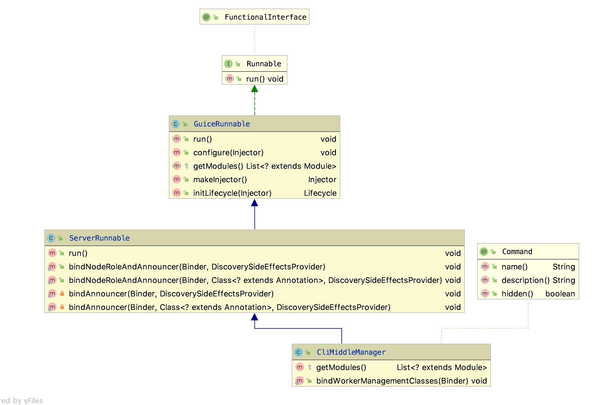 List<Class<? extends Runnable>> serverCommands = Arrays.asList( CliCoordinator.class, CliHistorical.class, CliBroker.class, CliOverlord.class, CliIndexer.class, CliMiddleManager.class, CliRouter.class ); // group可以认为是命令行的前缀 builder.withGroup("server") .withDescription("Run one of the Druid server types.") .withDefaultCommand(Help.class) .withCommands(serverCommands);