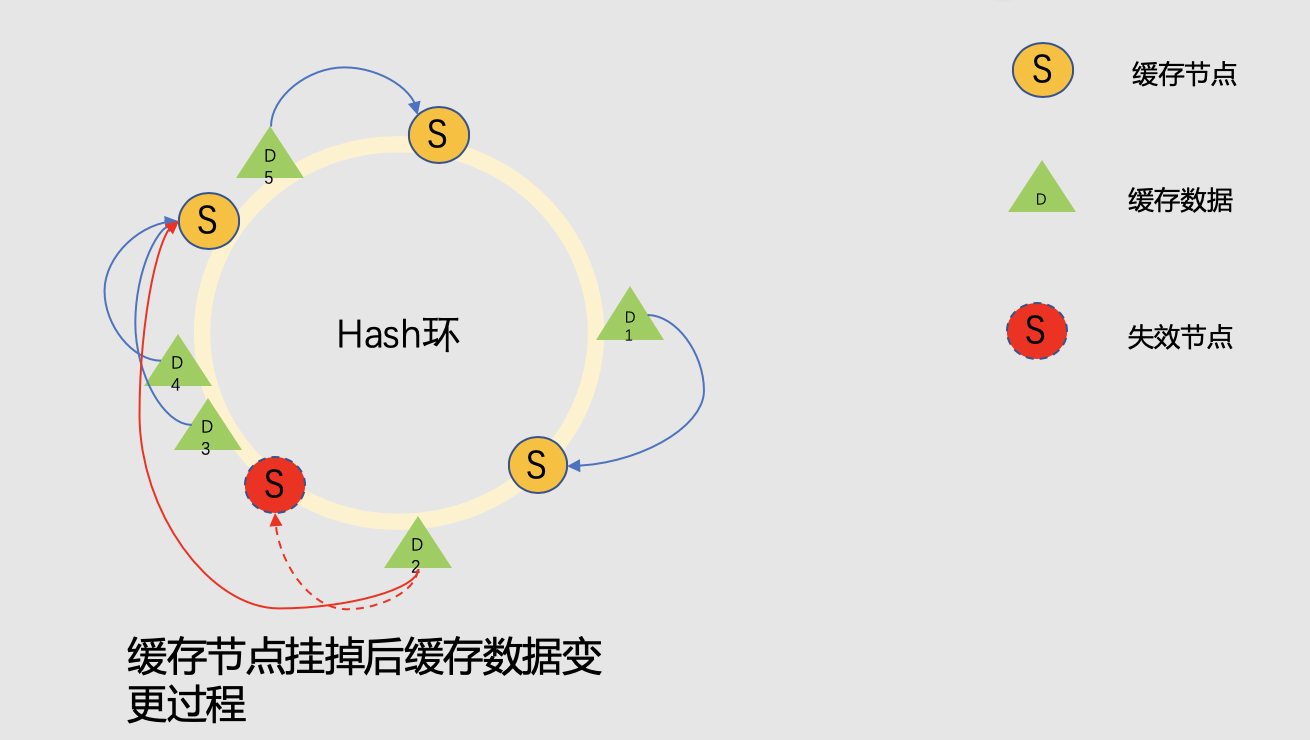 假设D2所在的服务器挂掉了,那么D2所在节点的缓存将会失效,D2将会顺时针寻找下一个缓存节点来进行存放缓存数据,这样旧的缓存数据都还继续对外提供服务,