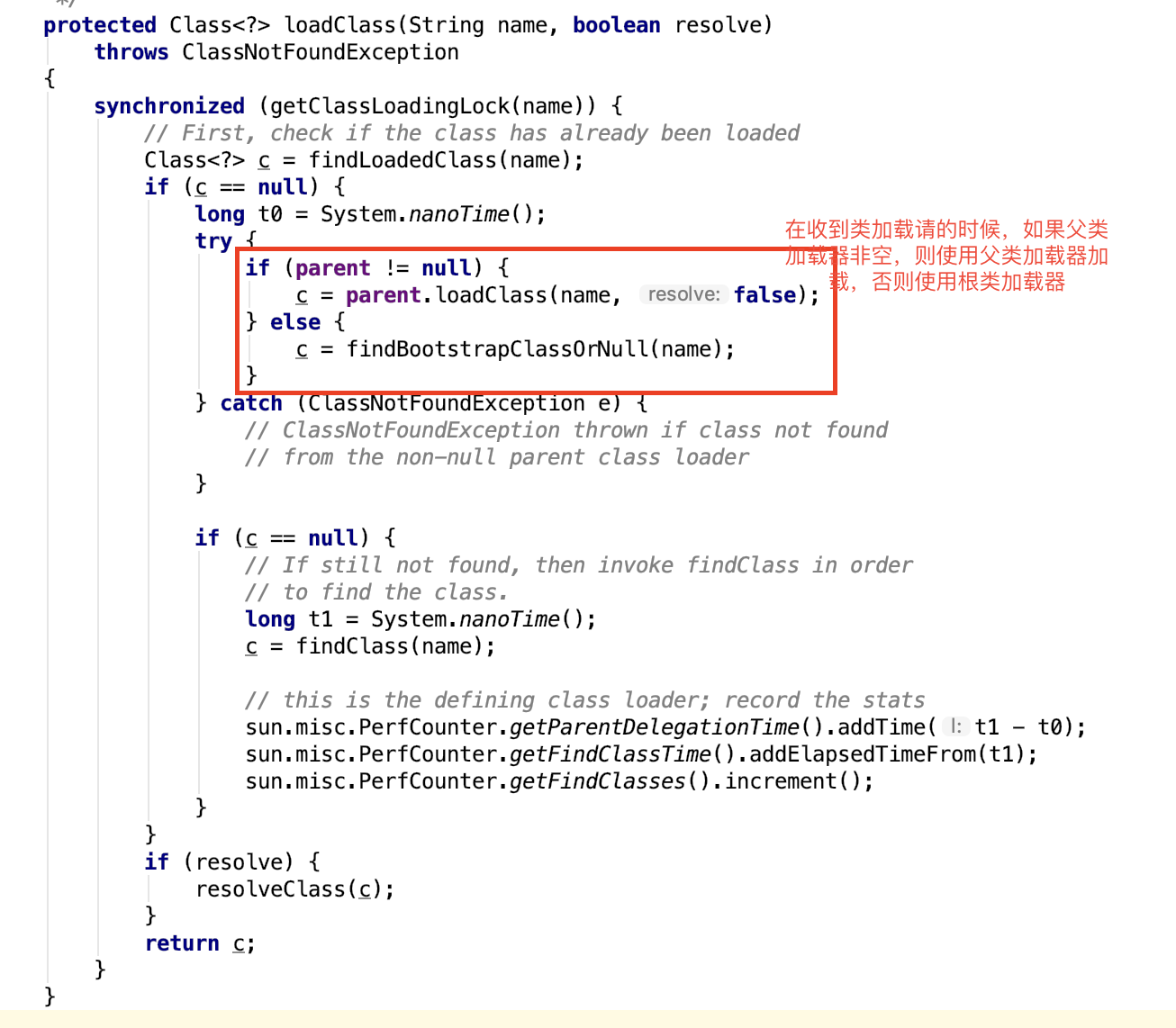 才会将该请求传递给子ClassLoader,完成类的加载,对应的代码如下: