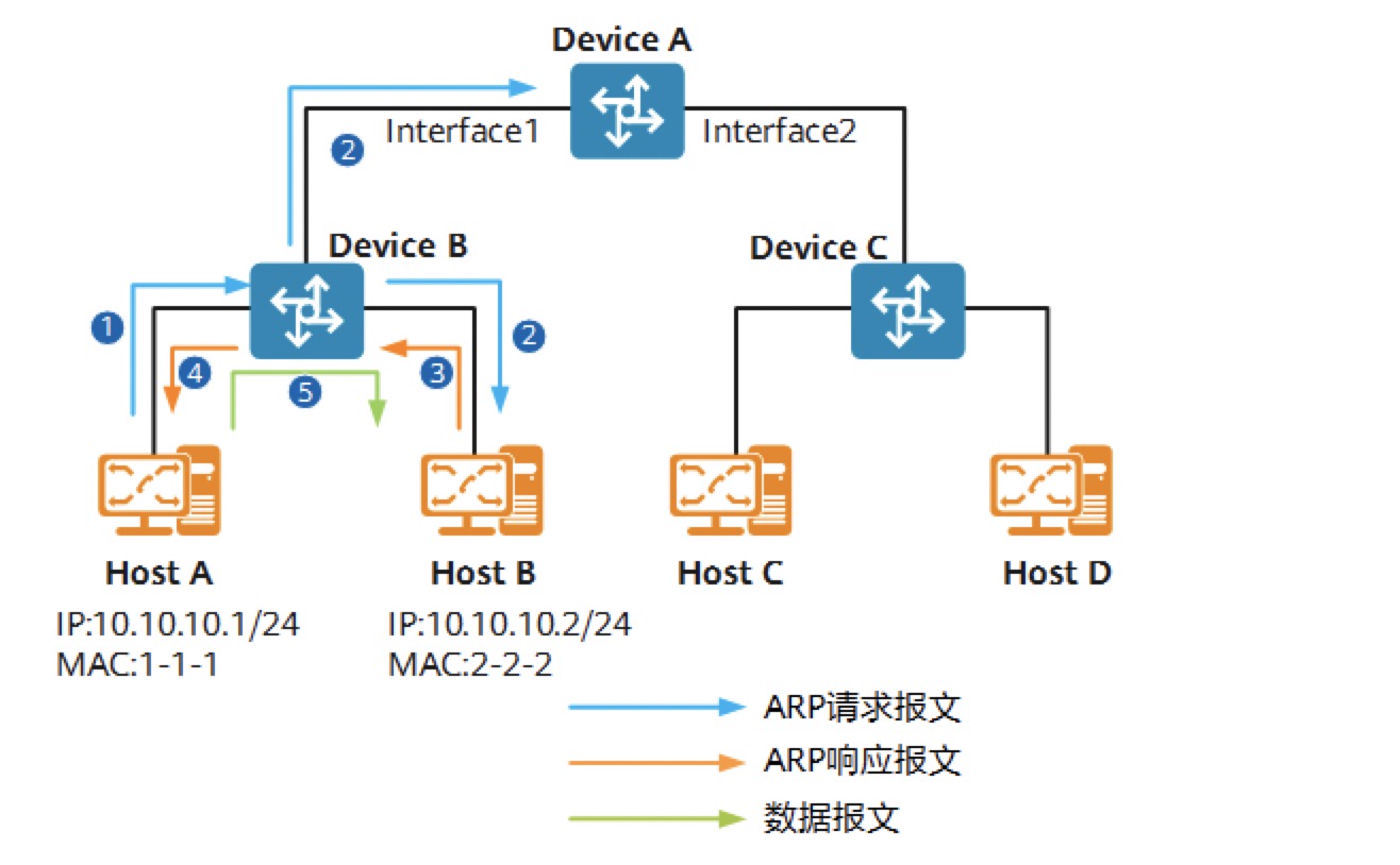 • DeviceB收到该ARP响应报文之后会将该请求单播给HostA