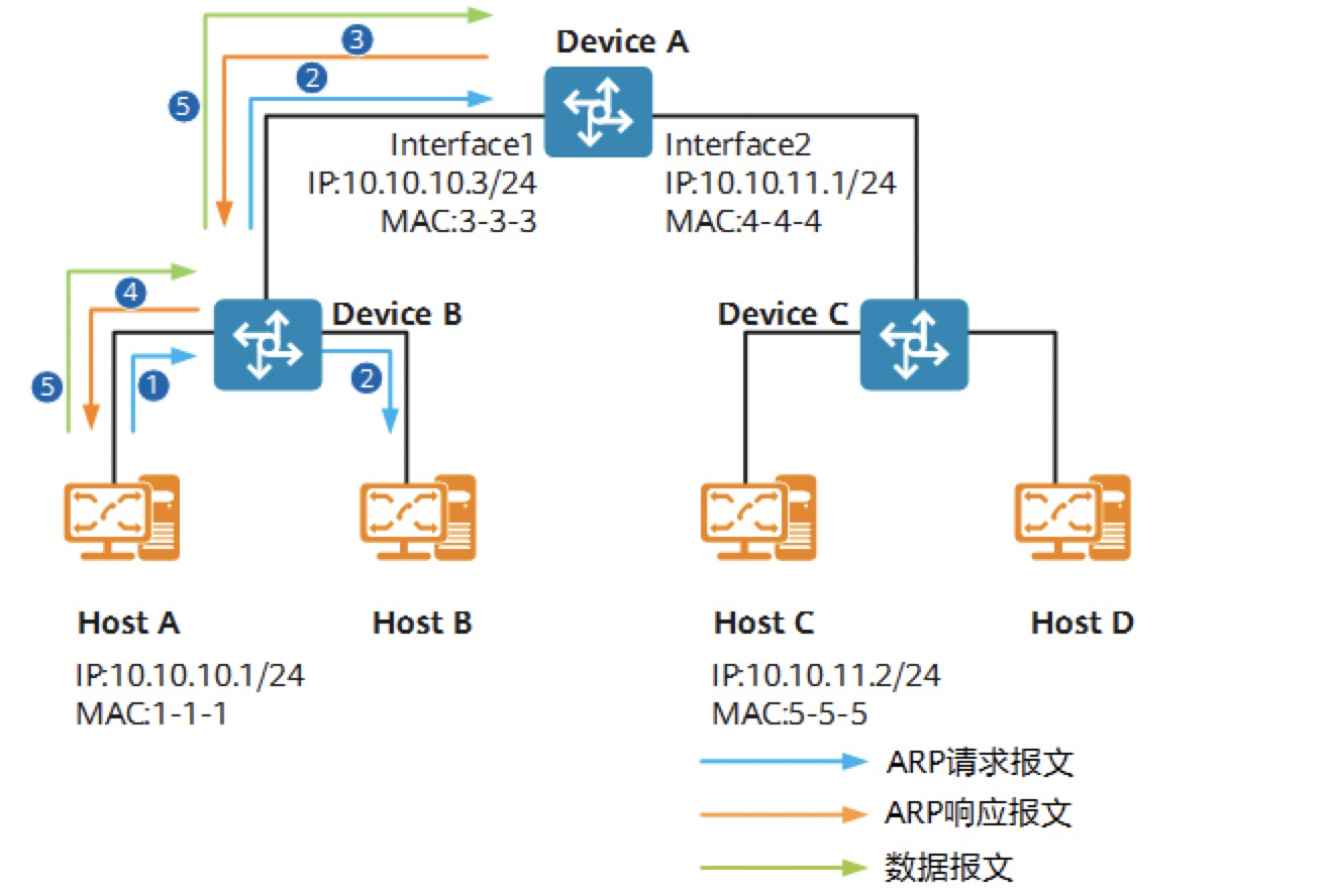 • DeviceB在收到该报文的时候发现MAC地址是全0,将会在本网络内广播数据 接下来的过程就是DeviceA响应HostA的ARP请求并更新各自的ARP表项了,具体的过程和上面同网段ARP的实现一致,因此不再赘述了