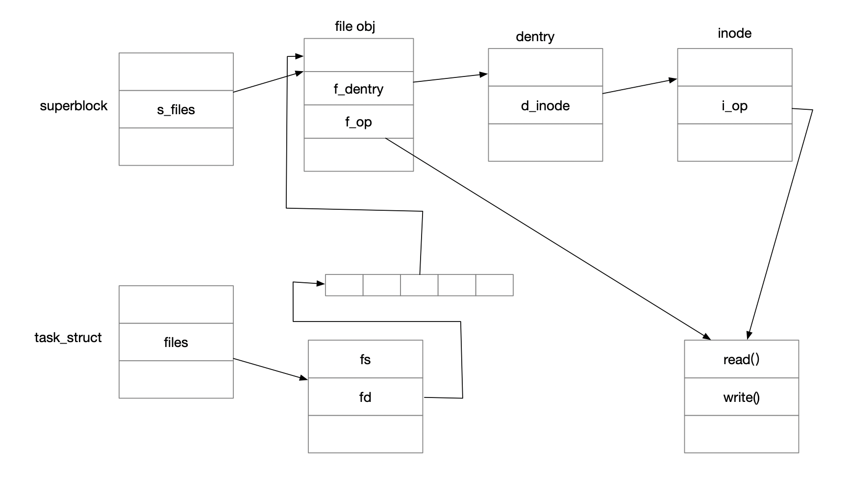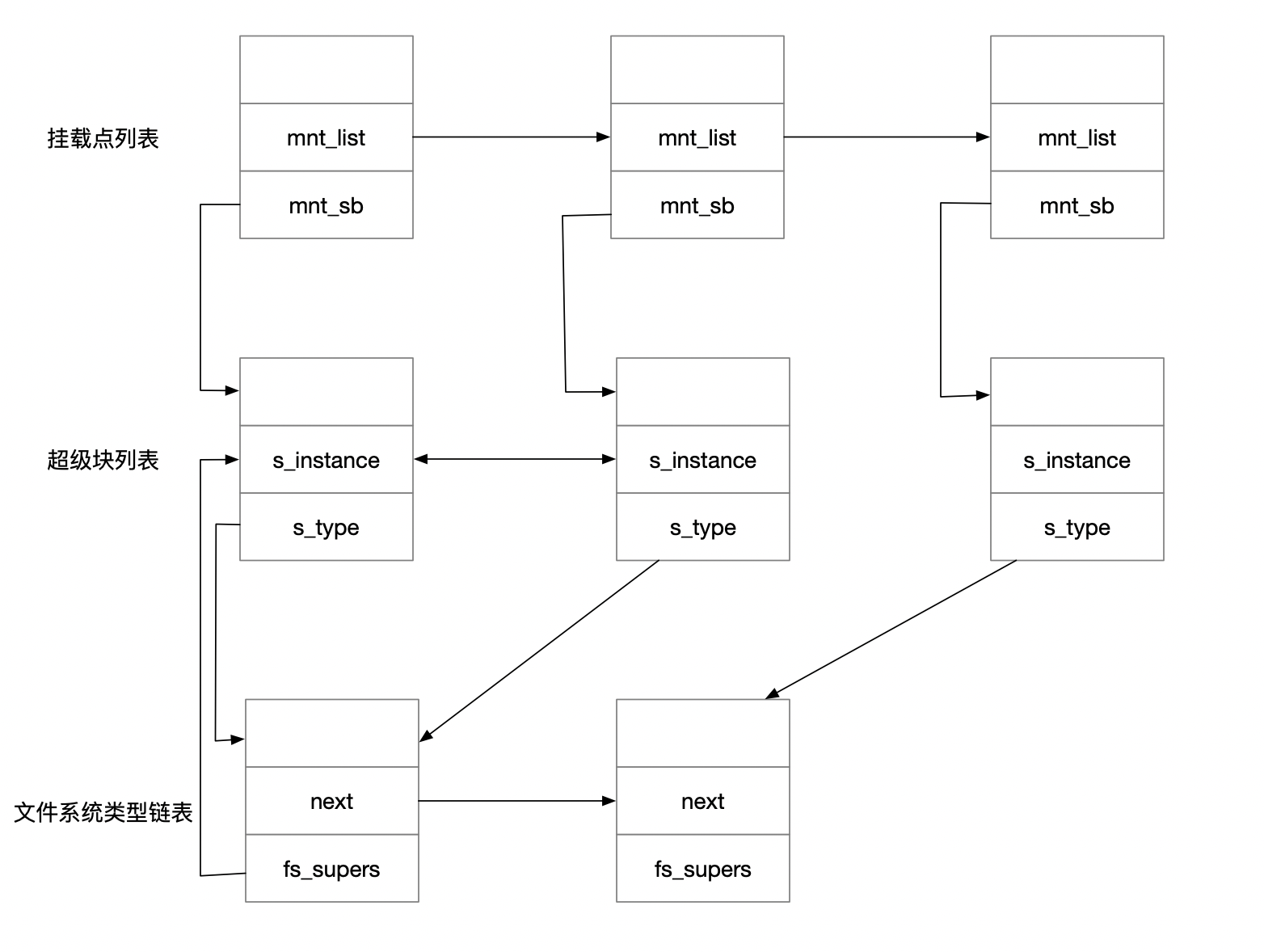 每mount一个文件系统实例都会有一个mount点和超级块与其对应,mount节点是通过mnt_list链接起来的,超级块是通过super_list链接起来的, mount节点结构中有一个mnt_sb指向该节点上挂载的文件系统的管理对象,也即是超级块。