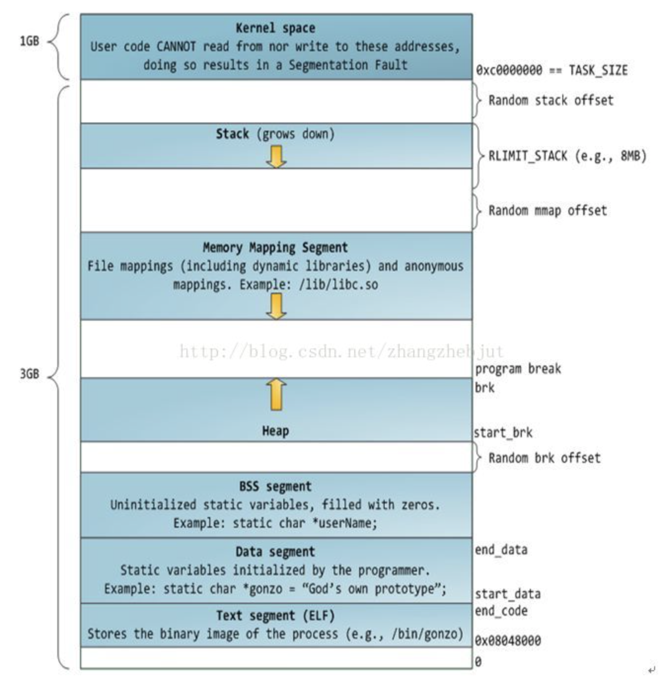 这里需要说明一下,内核会给每个进程分配8k的内存,用来存储thread_info结构和内核栈,内核栈是由于进程 在内核态运行的时候需要自己的堆栈来保存一些变量,这个栈不同于用户态进程所用的栈。 另外thread_info是由于针对不同的平台,我们访问的方式不尽相同,thread_info封装了通用的逻辑来访问task_struct