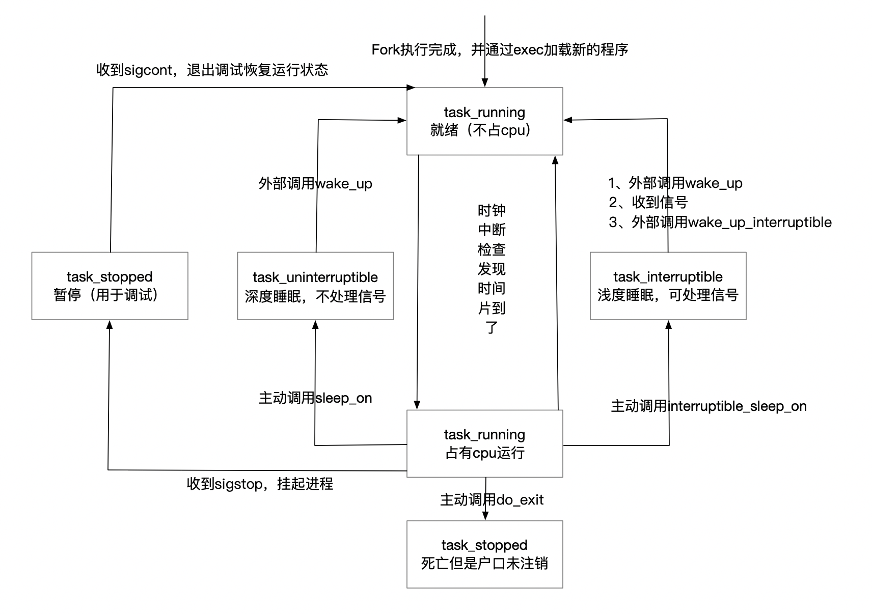 • exit_zombie: 俗称的墓碑状态,该进程已经结束,但是父进程还没有调用wait4或者waitpid返回当前进程的信息,此时进程描述符(task_struct)仍然存在