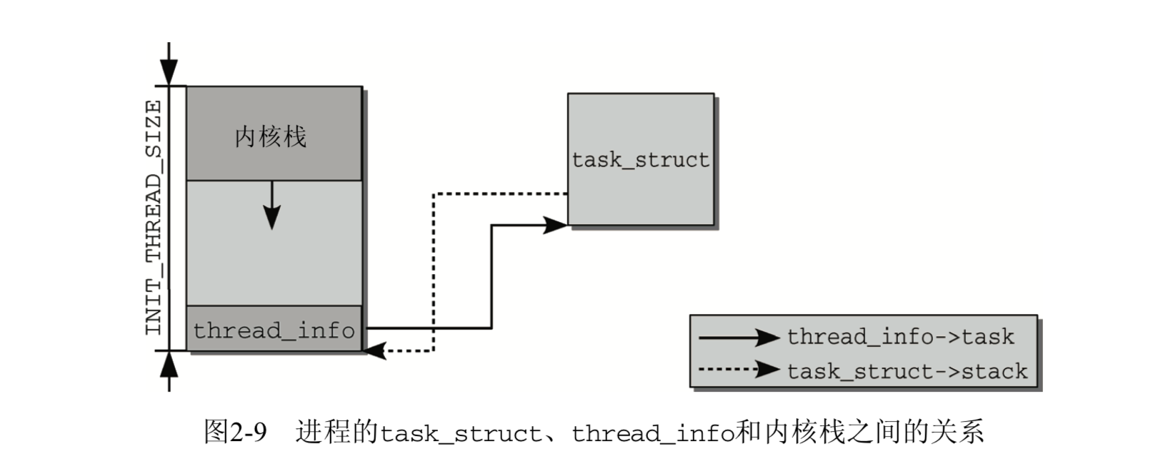 进程对应的结构体如上所示,这种结构体被thread_info所指向,下图描述了thread_info、进程内核栈、task_struct之间的关系: