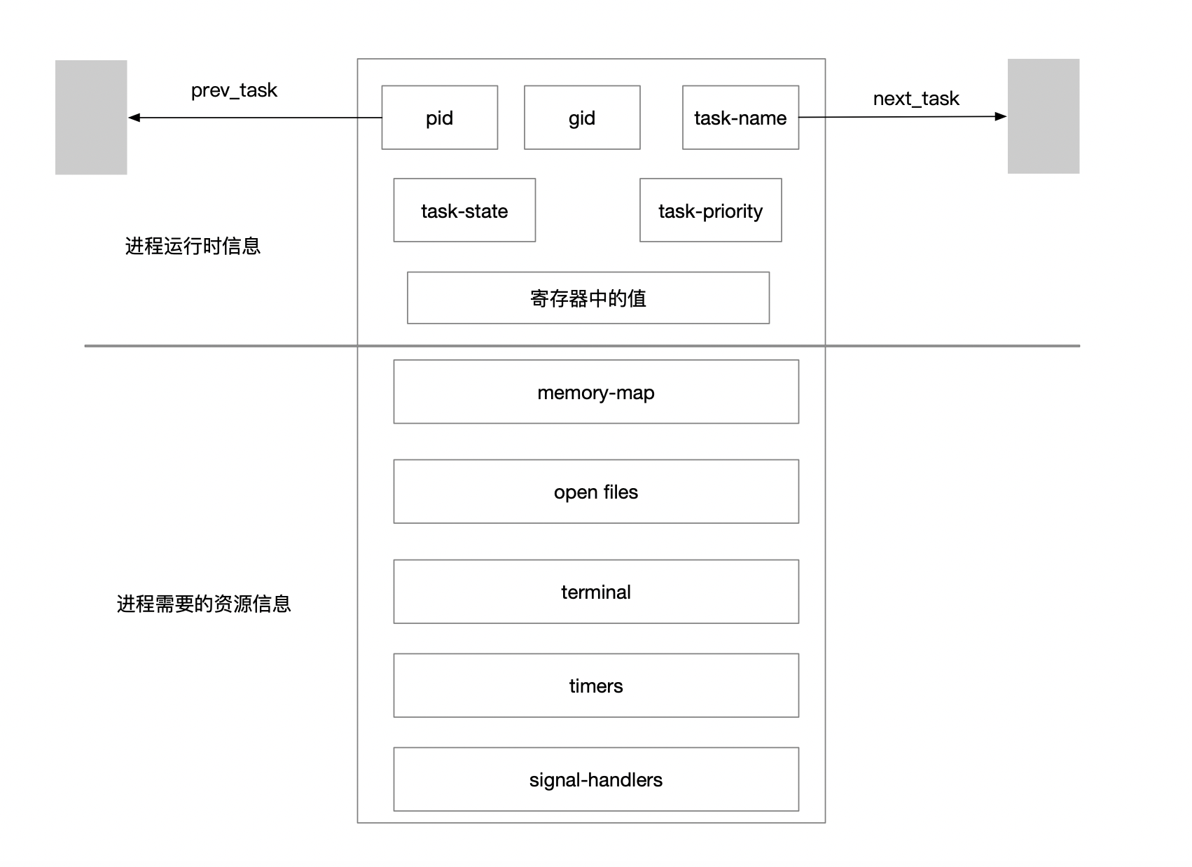 上面是进程的资源的分布,不过这些资源需要一个结构来进行管理,管理这块内存空间的结构我们称之为进程控制块-也即是pcb(也可以叫做进程管理器), pcb对应的数据结构就是上面的task_struct。进程控制块的主要作用如下: