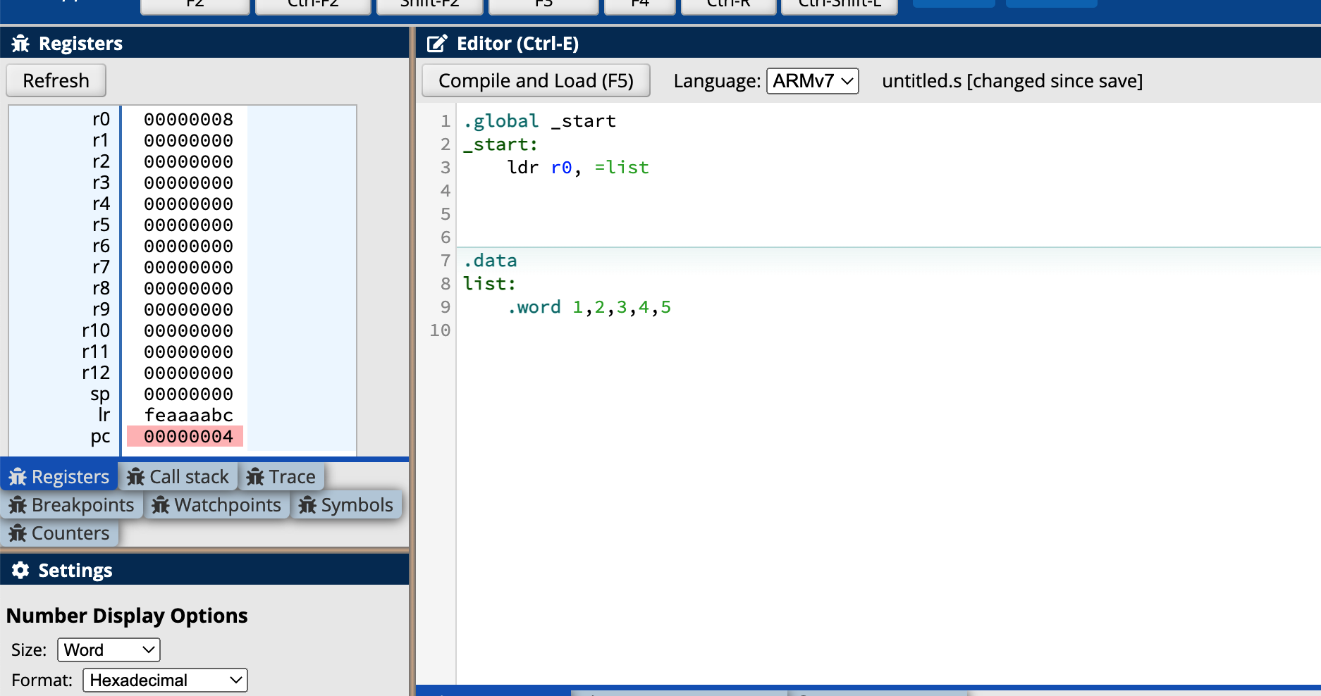 上面我们定义了.data段,这代表的是汇编语言程序的数据段,主要用来存放大量的数据,.data在汇编中是关键词,就像.global一样,可以很明显的看到其和label最大的区别就是后面没有“:”,接下来在data段中我们定一个变量list,变量的名称叫做list,然后我们定义了list的类型.word,值得注意的是汇编语言中的数据类型,.word表征的可以是整数也可以是浮点数,同样的数据类型也还有halfword、doubleworld、byte、bit等。