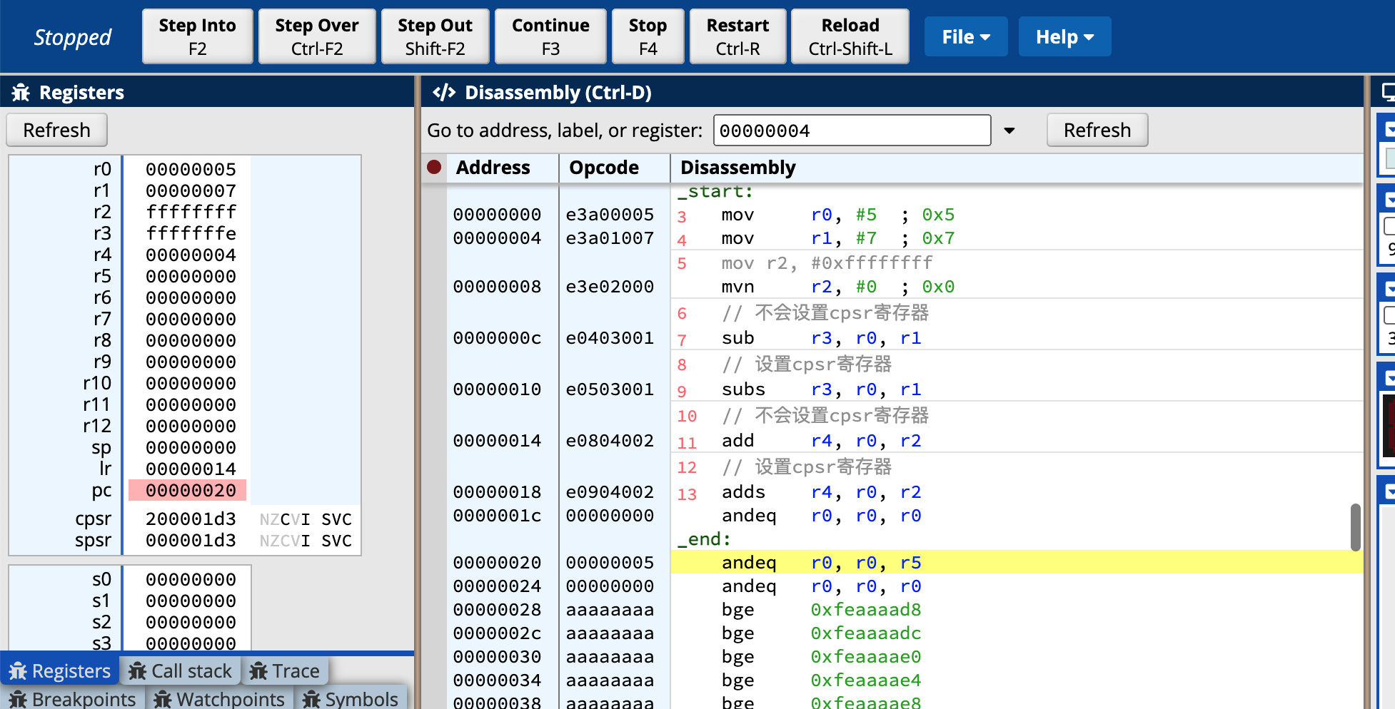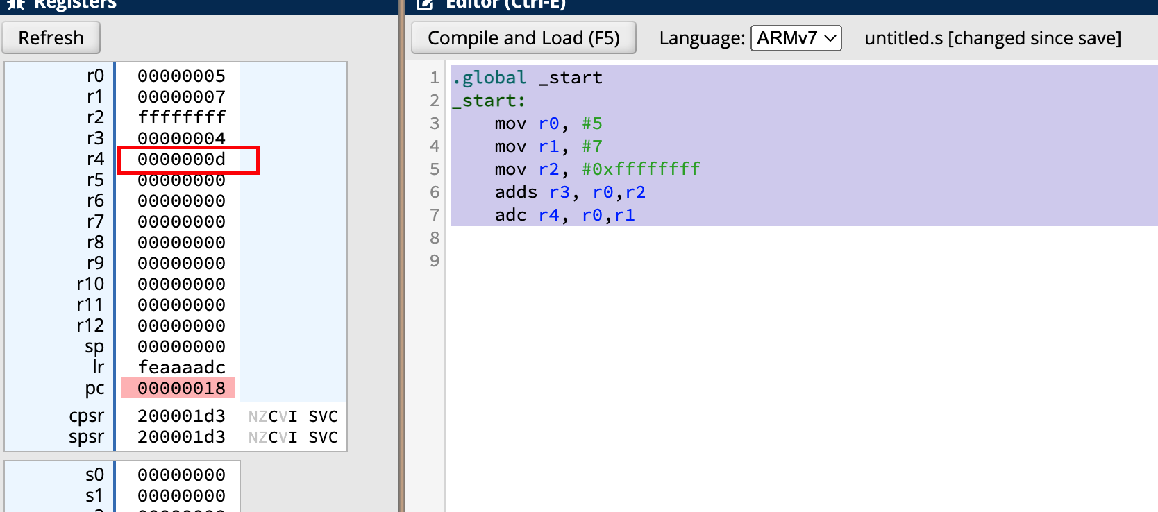 可以很直观的看到7+5的结果应该是12,对应的16进制就是c,但最终结果r4中显示的是d即13,说明adc讲cpsr中的结果计入了最终运算的结果。