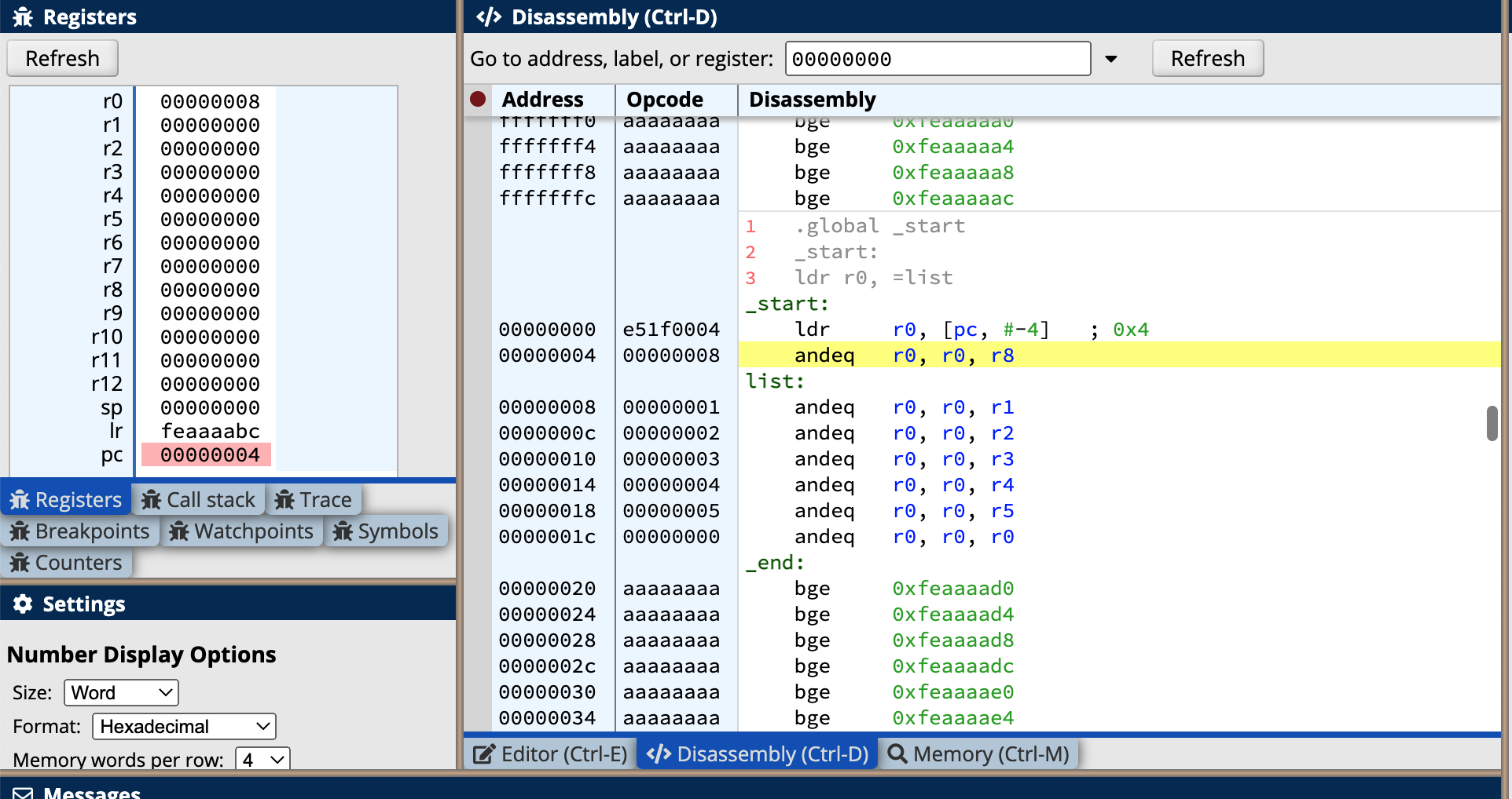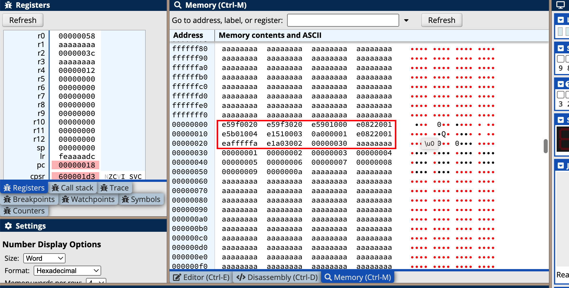在程序的执行过程中我们可以看到寄存器的状态如下: