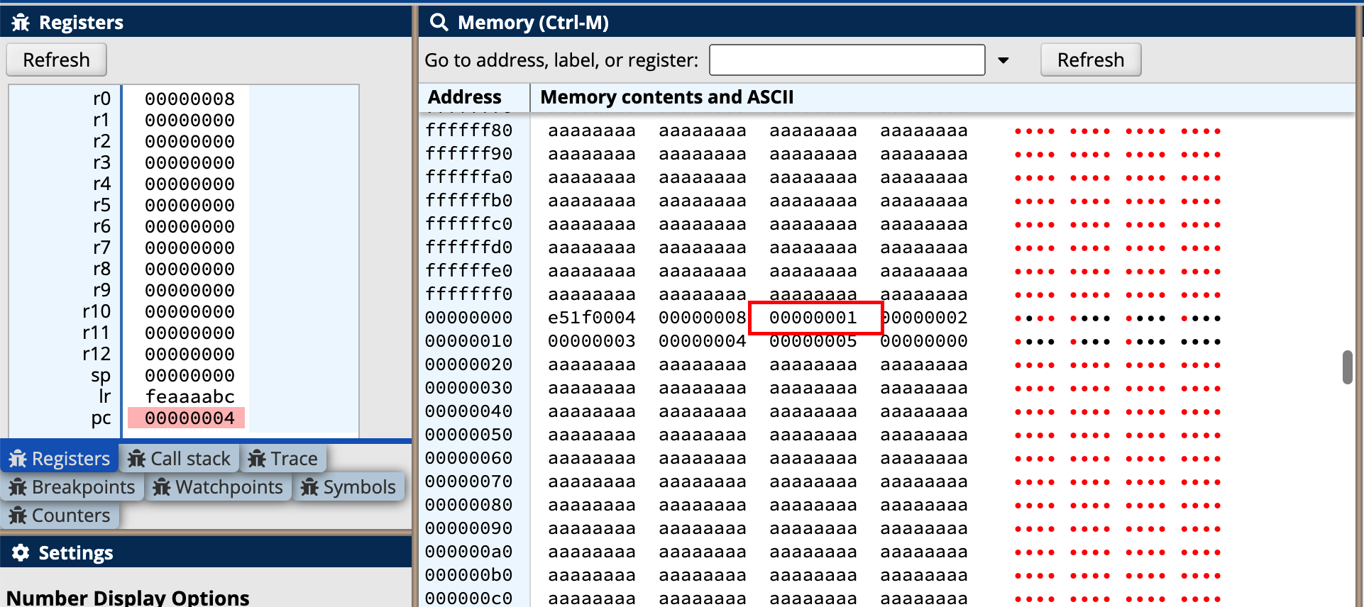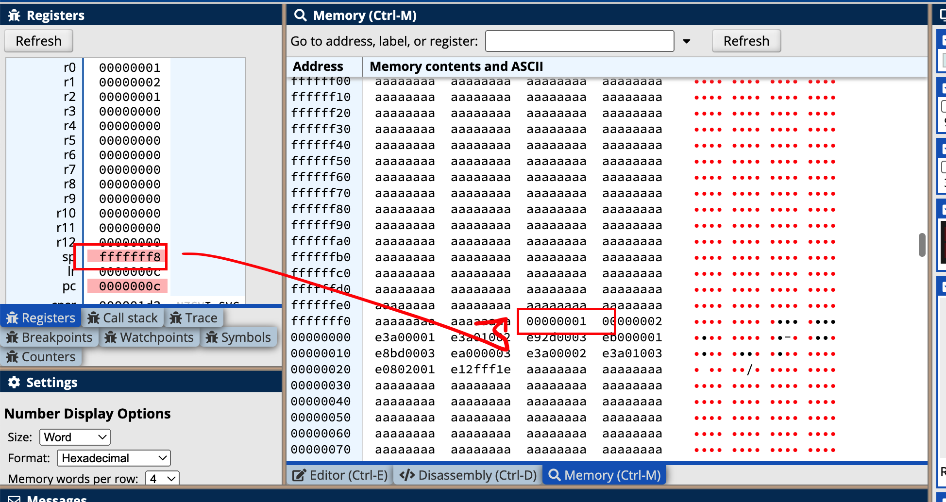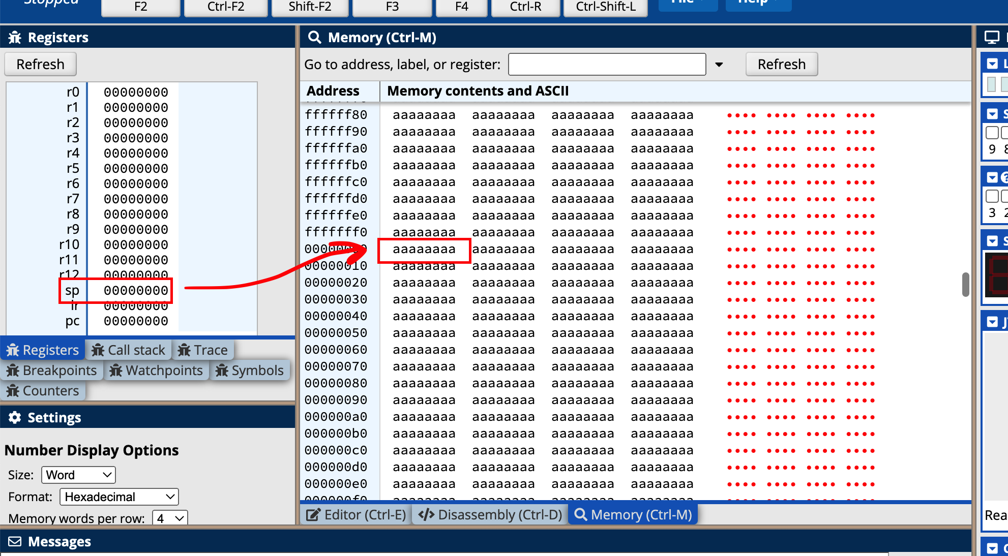 我们可以看到寄存器中的值,并根据寄存器中的值查看stack对应的内存区域的数据,如下: