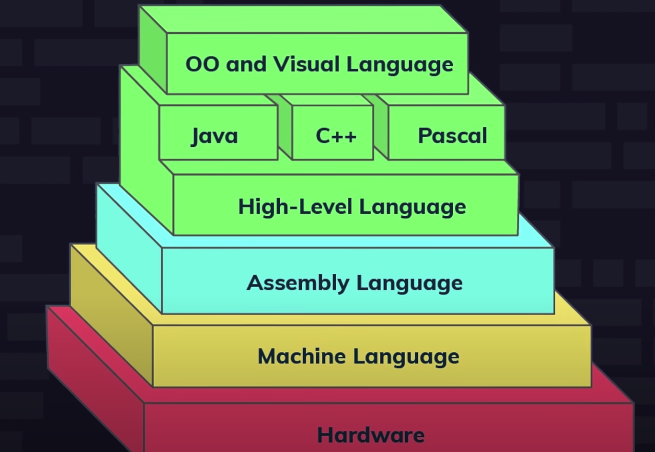 汇编语言是最接近机器语言的编程语言,如下图所示,汇编语言介于机器语言和高层语言之间: