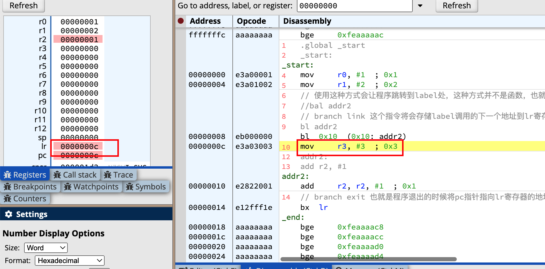 上述代码在执行的过程中最重要的变化就是lr寄存器的变化: