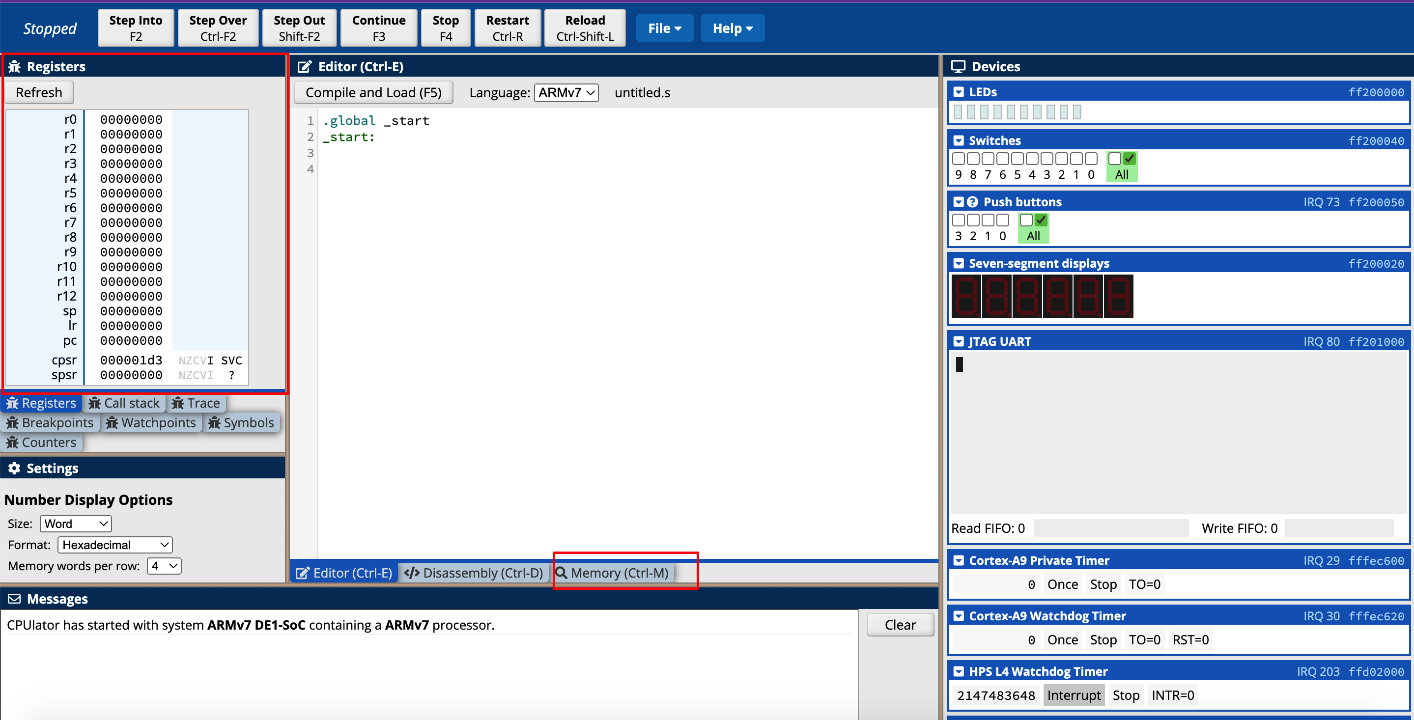 在线调试环境的右边我们可以看到和arm交互的硬件,对于交互的硬件只有两种类型,输入、输出,接下来我们将选择switch作为输入,led作为输出(可以看到在线仿真的平台有很多可以交互的外设,不过最简单的就是开关和led了,因此我们也以此为例,其他类型的设备需要依赖于具体设备的参考文档了):