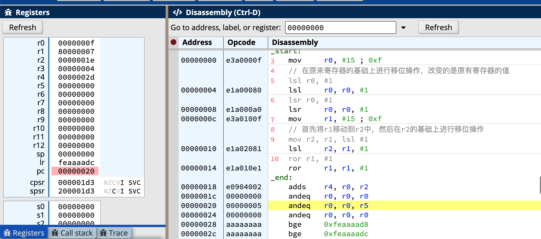 需要牢记的是,cmp操作之后,会将对应结果存放到cpsr中,因此,接下来的各种跳转操作都会给予最近一次的cpsr中的结果进行判断,如果满足bxx则最终就会陷入分支中去执行,并且最后并不会跳出分支,如上述代码,如果r0大于r1就会跳转到greater分支,并且后续的mov r3的操作也不会再执行了(没有一个返回操作,调用greater的label的操作不是函数调用,不会在函数执行完成之后返回到函数的调用处)。如果最终比较的结果没有任何一个分支满足的话,就会顺序的往下执行,并且如果在后续的执行过程中没有遇到终止的条件的话,会一直执行下面所有的分支,此时并不再是label的调用,就上述代码而言,因为cmp的操作并不满足bgt的结果,因此其首先会跳过bgt的代码,然后顺序执行mov r3、greater、always的操作。注意bal分支只要存在永远是放到代码执行完之后执行。