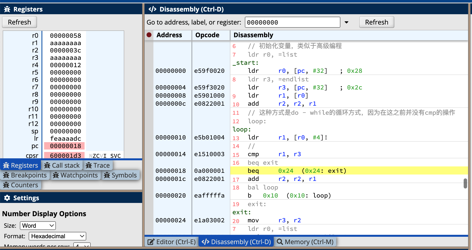 在高等计算机编程语言中,我们通常使用的循环类型有for、do -while、while-do类型。下面以do-while类型的循环为例进行相应的求和操作,这里我们预先初始化了list的终止条件,也就是endlist,不过在真正的高等语言中,通常是使用特殊的符号作为终止的标记(毕竟我们无法预知内存中的终止数据究竟是什么),对于下面的循环相较于高等语言来说也是类似的,初始化,进入循环,判断是否终止。这里需要注意的是对于汇编语言中的常量通常是使用类似于宏的定义预先定义好,在家在常量到寄存器的时候要使用ldr的指令,不可以使用mov指令,并且访问数据的时候要用到= ,不可以直接将如数据移入寄存器,具体代码如下:
