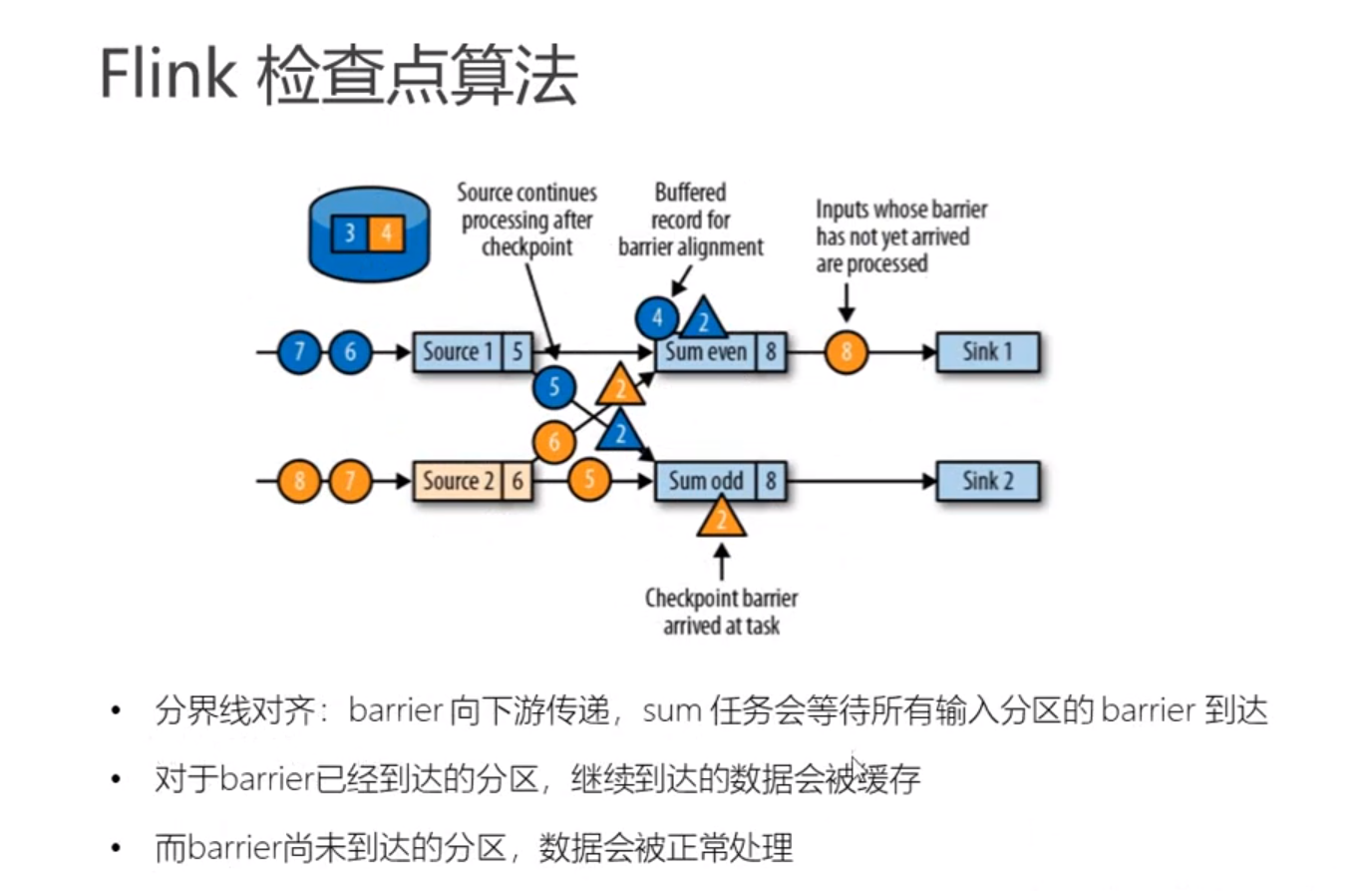 并且是由jobmanager负责协调产生的。上图中的2代表了chekpoint的id,jobmanager将chekpoint barrier(包含了checkpoint id信息的一条event)