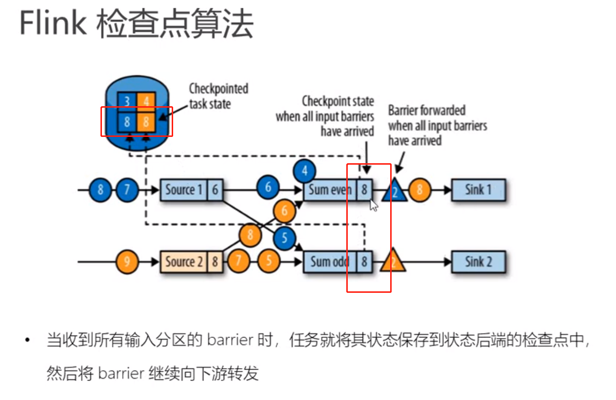 所有的任务都完成之后,jobmanager就会收到对应的信息,这样这个checkpoint就完成了保存,后续的任务就可以从这个checkpoint中再次恢复出来。