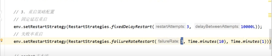 重启配置中失败率重启是存在了两个判断条件:中间的参数代表了允许重启的最大时间段,超过这个时间段还没有完成重启的话,就认为任务失败了,第一个只带了10分钟内超过了三次也算失败,