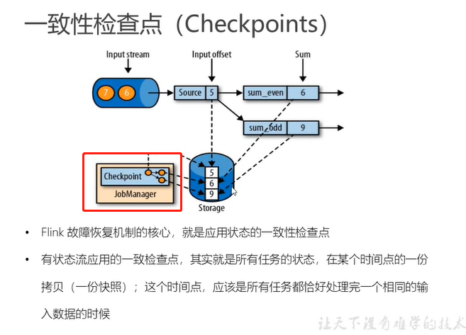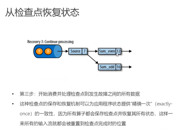 这里的同一个时间点的一份快照准确的说是同一个数据的快照,也就是说所有的下游任务都处理完了同一个数据,那么这样就可以确保全局的状态的一致性 - 恢复