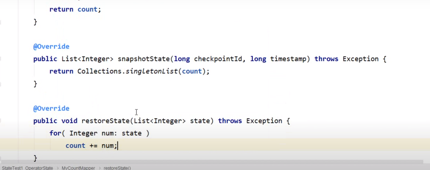 因此持有状态的算子还必须实现ListCheckpoint的接口(接口是一个泛型,其保存的类型和本地变量的类型要一致),在实现保存点状态恢复的时候需要注意其参数是一个List,
