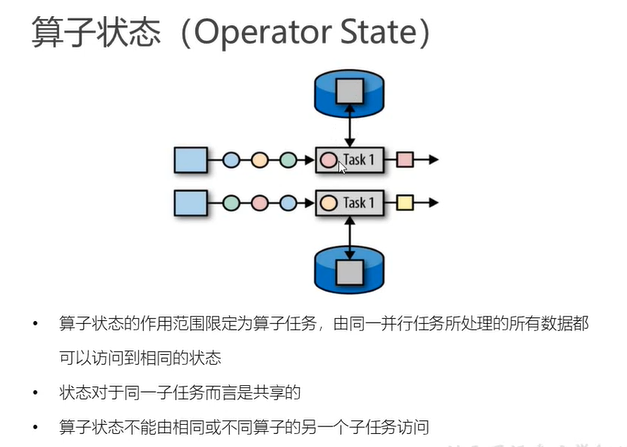 - operator state:针对operator来说只有一个状态(是分区级别的状态),subtask级别共享的状态信息,同一个task不同的subtask是无法做到共享的,