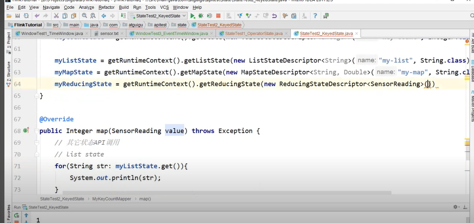 reducingState要求传入三个参数,其中中间的参数是一个reduceFunction,该reduceFunction会在下面诸如map中更新这个值的时候被使用。代码如下: