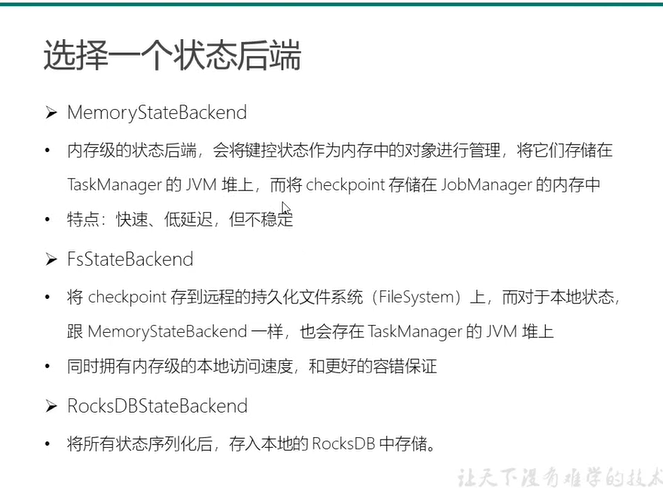 上述两种类型的state都需要有对应的状态后端支持,这里的状态后端就是state backends,常见的状态后端有MemoryStateBackend、 HDFSStateBackend、RocksDBstateBackend。提到state就不得不提另外一个概念Checkpoint,Checkpoint是将上述的状态 数据持久话起来,对于MemoryStateBackend和HdfsStateBackend来说其状态数据是存放到Taskmanager的堆内存中,在做checkpoint的时候 MemeryStateBackend是把checkPoint的数据存放到jobmanager中,我们知道jobmanager的内存大小一般是有限制的,因此MemoryStateBackend并不 适用于生产环境中执行的作业,因为一旦作业挂掉了状态就会丢失,二对于HdfsStateBackend在做checkPoint的时候会将对应的数据存放到hdfs上进行持久化,因此 状态可以保存很久,对于RocksDBStateBackend来说,作业在运行的时候状态数据并不是保存在TaskManager的堆内存中的,二十保存在Managed memory中的对外内存的, 在做checkPoint的时候则是将持久化的状态数据写入到HDFS中,不过使用MemoryStateBackend有一个需要注意的问题,那就是其只支持Keyedstate,并不支持 operatorstate。