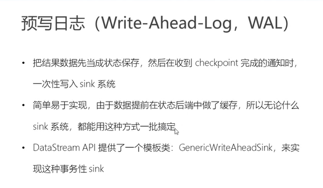 flink中提供了这种sink类可以用来实现在checkpoint完成之后写入到外部系统,可以实现基于WAL的事务性sink,不过这种存在问题,那就是批处理模型