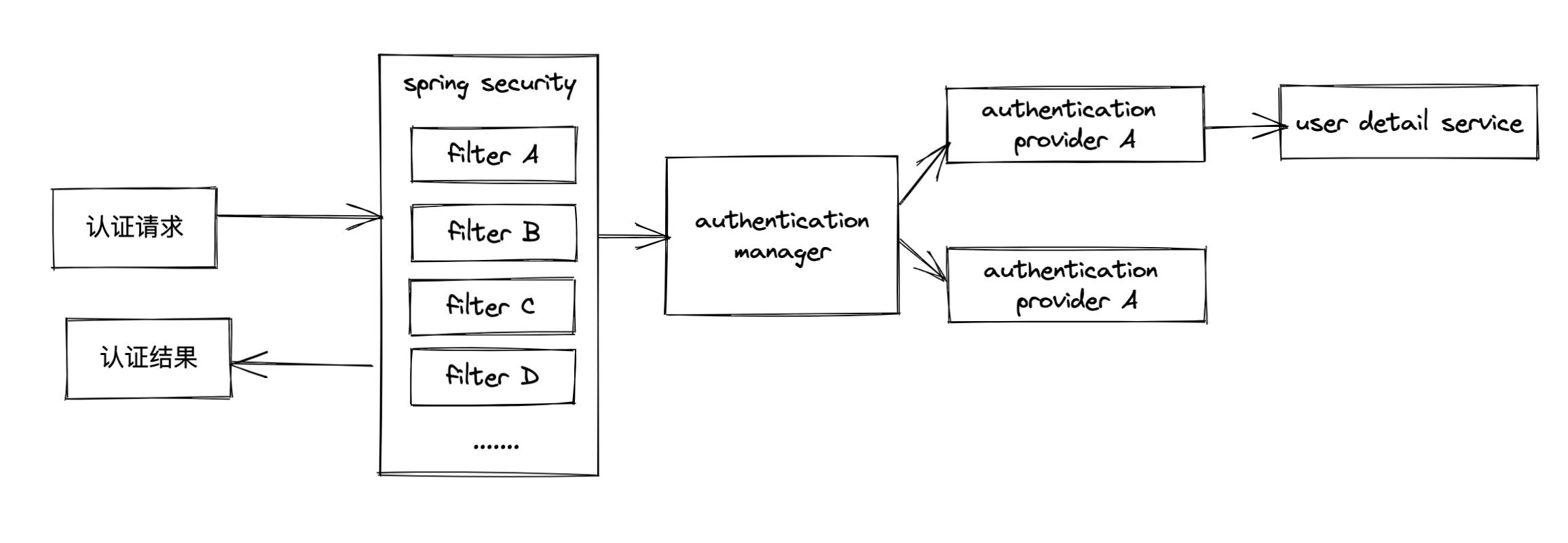}在quickstart那里我们看到了请求的认证流程,authenticationManager会接受用户信息(authentication),然后传递给authenticationProvider,authenticationProvider自然就需要对接收的参数的合法性进行判定,这就是上述supports的来源,如果我们需要自定义待认证的model的话,这里的support就需要对类型进行识别,为了方便支持多个authentication对象的认证,我们可以实现多个provider,并将其和authenticationManager进行关联即可,在用户认证的时候会首先调用support类,如果返回为true,就继续认证,否则进入下一个provider来验证。我们在实现上述认证的时候并不是通过filter将请求拦截并传递给authenticationManager的,而是主动的调用authenticationManager的auticate方法进行认证,这点和默认的认证机制是不同的,需要明确注意。