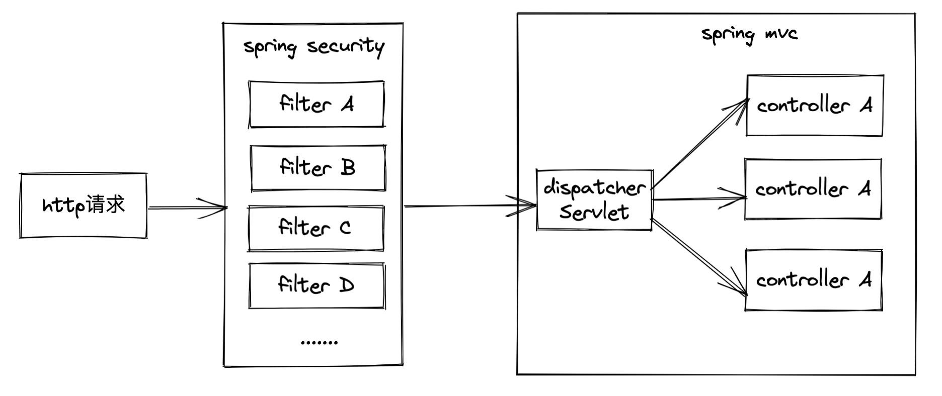 spring security 就是通过对dispactherservlet的保护来实现整个应用保护的,其通过filter chain实现基于filter的保护机制,具体如下: